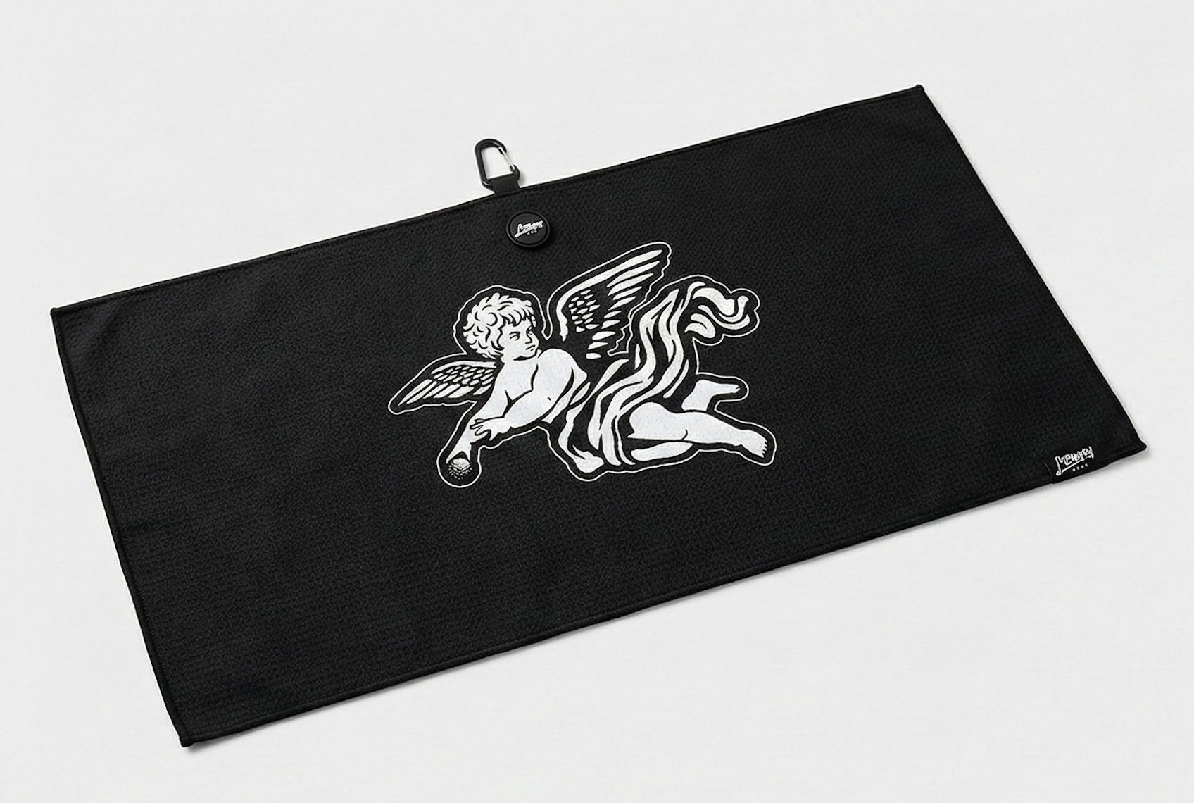 The No Bogey Club Angel Edition Golf Towel blends premium performance with a heavenly touch. Featuring a bold double-sided cherub design, a built-in magnetic attachment, and a signature No Bogey Club apothecary tag, this towel delivers both style and function every time you hit the course.